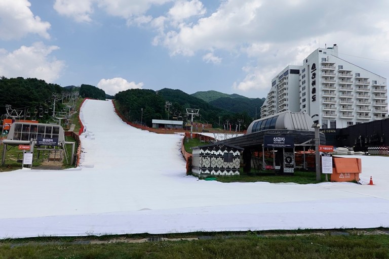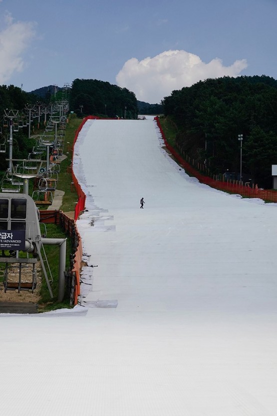 사진상 슬로프의 형태는 하얗지만 눈이 내려 쌓인 사면이 아닌 물이 뿌려진 미끄러운 슬로프와 같은 느낌으로 보시면 된다.